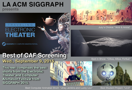 The Traveling Electronic Theater from SIGGRAPH 2015 is coming to our chapter in September. This reel comprises the best shorts from the Electronic Theater and Computer Animation Festival. 20 hours of shorts and excerpts featuring the latest and greatest in Computer Animation are presented here in this approximately 90 minute film.