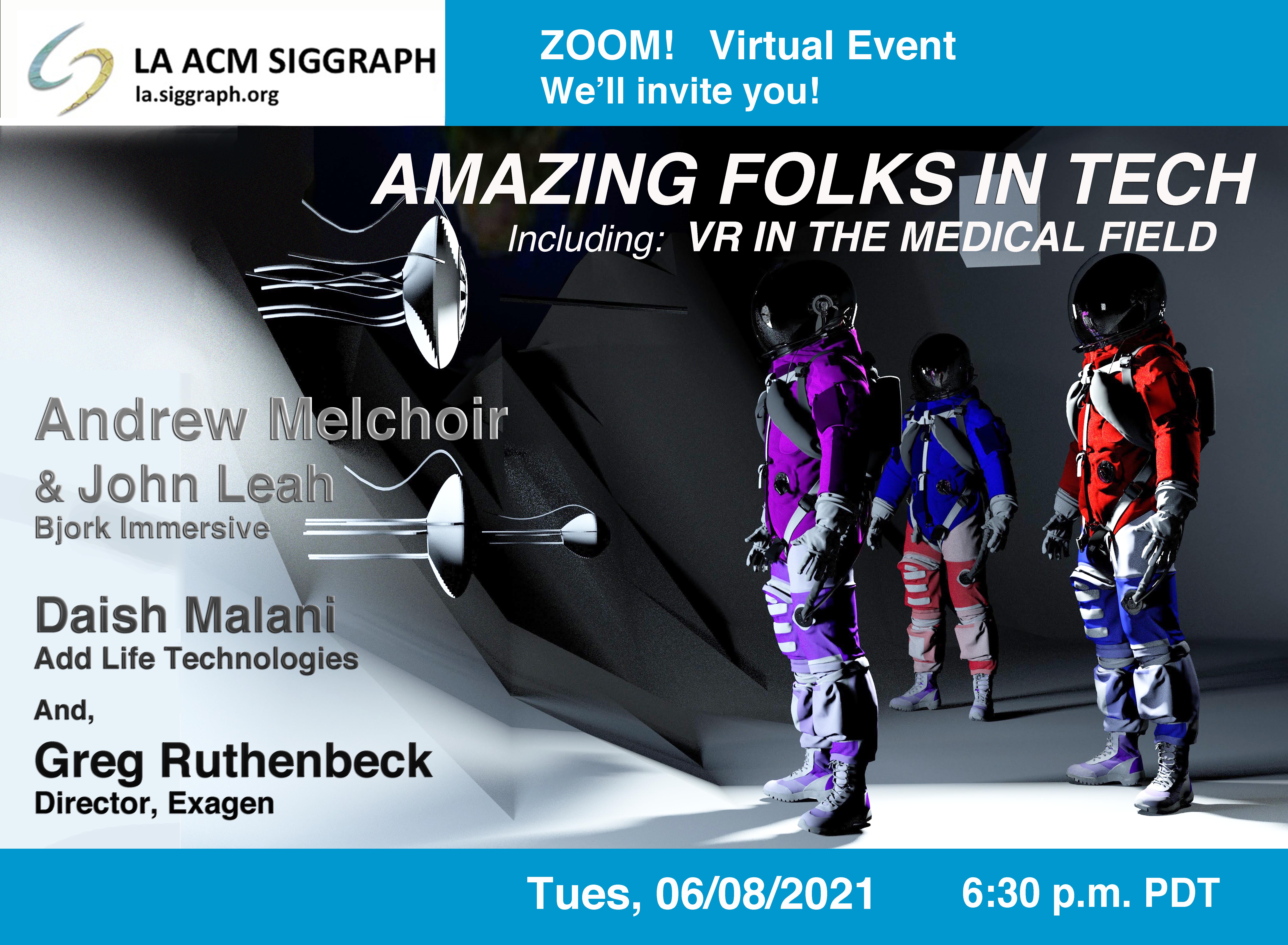 As medical professionals strive to use VR with accuracy: learn from three medical professionals using VR. Amazing Folks in Tech will be LA ACM SIGGRAPH's June 8th event. Presenters include:  John Leah, and Andrew Melchior, from 3rd Space Agency; Daish Malani, from Add Life Technologies; and Greg Ruthenbeck, with Exagen Oy.  Kyle Carlin will be the moderator. Register with Zoom.