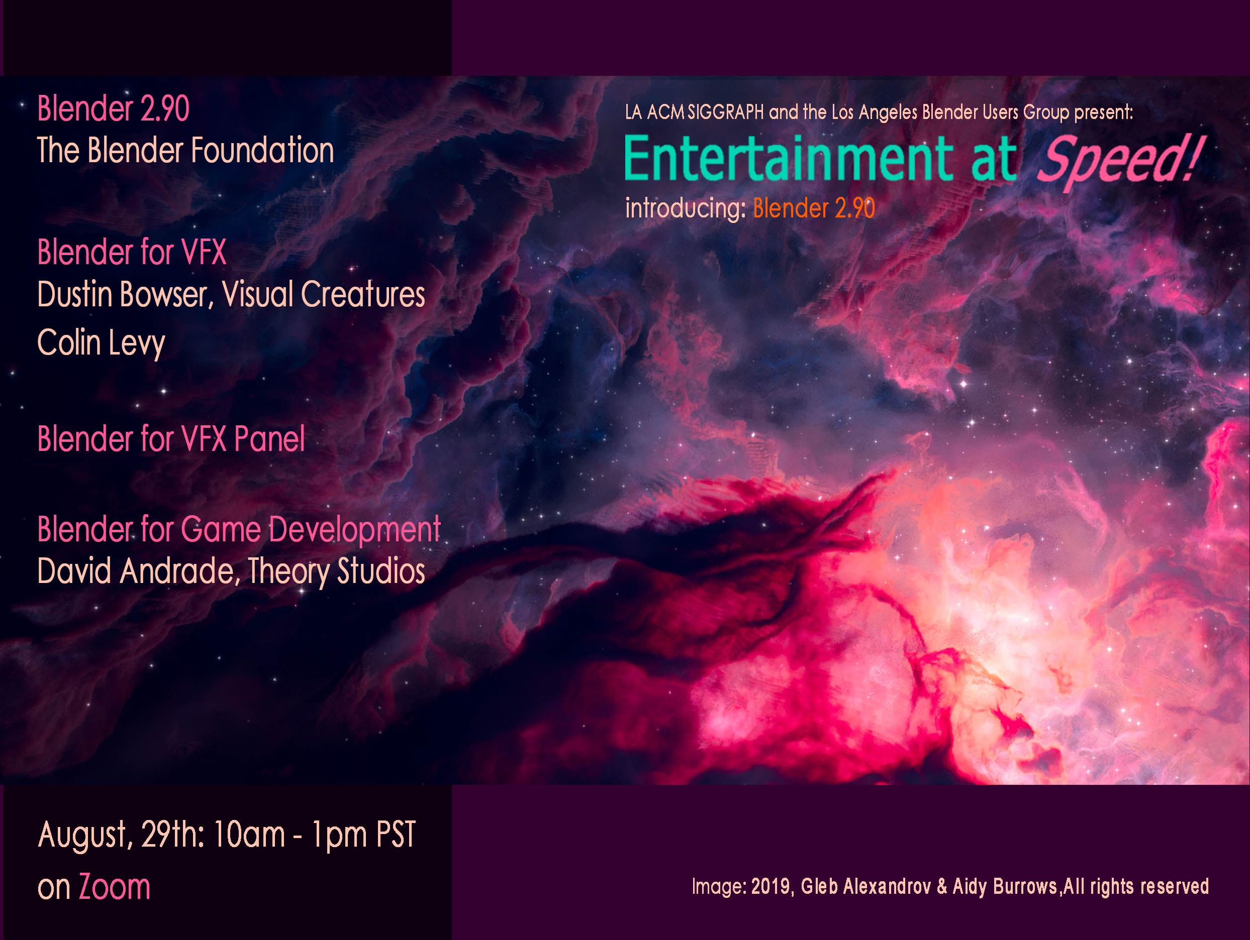 This LA ACM SIGGRAPH  and LA Blender User Group joint Zoom event will feature an overview highlighting the new features of version 2.90, given by the Blender Foundation, as well as project presentations by working pros who use Blender in their day-to-day work at their studios. There will also be lots of Q&A so if you've been meaning to find out more about Blender this is your chance, and if you already use it, then this is an event you won't want to miss!