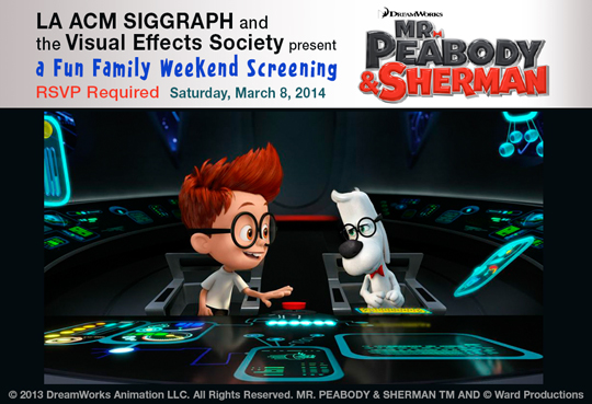 The Los Angeles Chapter of ACM SIGGRAPH, and the Visual Effects Society will host a one time only event Saturday, March 8th screening Dreamworks Animation's new feature film Mr. Peabody & Sherman.