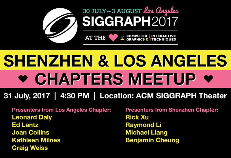 Joint meetup of LA and Shenzhen ACM SIGGRAPH chapters to discuss and explore common interests and goals. There will be ample time to initiate relationships for future opportunities and partnerships. Sign up on Meetup for your commemorative badge.