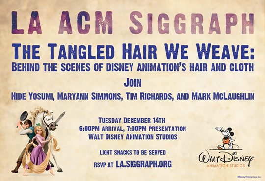 Los Angeles ACM SIGGRAPH Professional Chapter invites you to attend an evening of TANGLED TECHNICAL TALKS (no screening):  Tuesday, 14 December 2010 at the Disney Animation Studios in Burbank