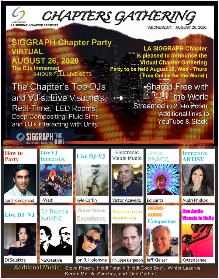 The Chapters Gathering event is a Free six-hour DJ-VJ set on Zoom; Wednesday August 26; at 5:PM – 11:PM PDT.  Starring: J-Walt, Kyle Carlin, Victor Acevedo, Ed Lantz, Audri Philipps, Steve Roach, Heidi Torsvik, Winter Lazerus, Keram Malicki-Sanchez, and Don Garbutt, DJ Selektra, Jamesen Re, Jon 9, Philippe Bergeron, Paul Carey, Jeff Kleiser, and Unity star Kytten Janae. Join LIVE anytime during the event after Free Registration.